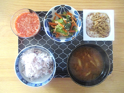 小松菜と人参とツナの胡麻和え、なめ茸入り納豆、玉ねぎとしめじと油揚げの味噌汁、トマトジュース。