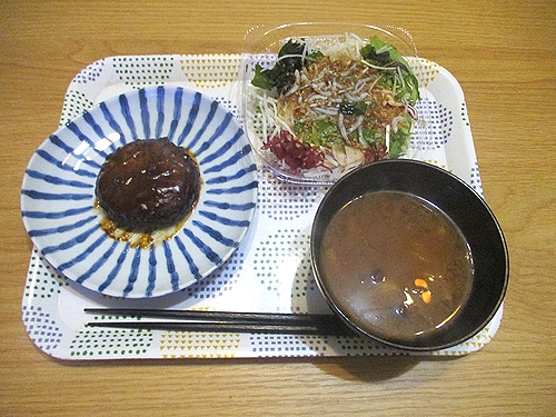 チーズ入りハンバーグ、大根サラダ、味噌汁、この後ヨーグルト。