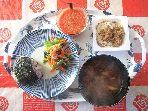 おにぎり、小松菜と人参とツナの胡麻和え、なめ茸入り納豆、玉ねぎとしめじと油揚げの味噌汁、トマトジュース。
