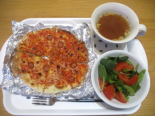 ソーセージピザ、ベビーリーフ&トマト、オニオンコンソメスープ、この後ヨーグルト。