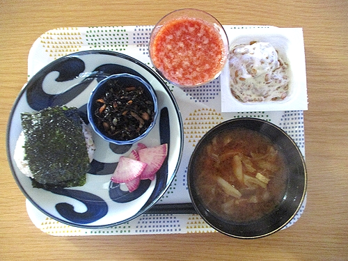 おにぎり、大根のぬか漬け、フジッコのおばんざい小鉢のひじきの煮物、納豆、キャベツとしめじと油揚げの味噌汁、トマトジュース。