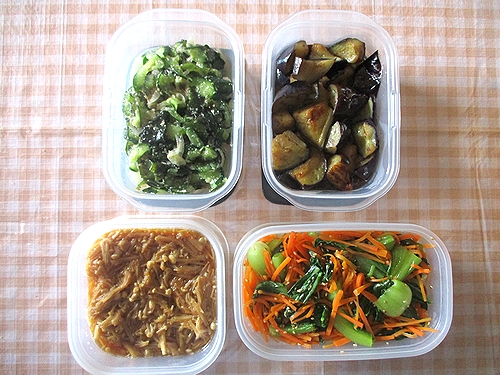 きゅうりと玉ねぎとワカメの酢の物、なす南蛮、なめ茸、チンゲンサイと人参の和え物。
