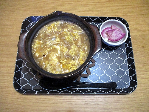 玉ねぎとしめじと玉子入りの雑炊、大根のぬか漬け。