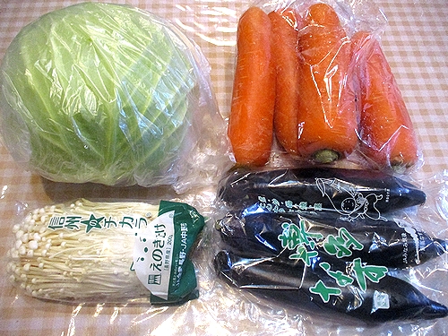 キャベツ、人参、えのき茸、茄子、以上で税込み1177円なり~。
