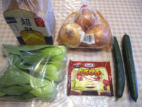 食パン、玉ねぎ、チンゲンサイ、とろけるチーズ、きゅうり2本、以上で税込み1136円なでした。