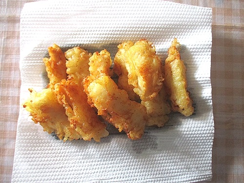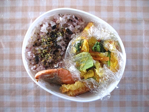 チンゲンサイと人参の和え物の玉子とじ、鮭の塩胡椒焼き、イカ天。