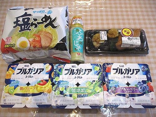 サッポロ一番塩ラーメン、ドレッシング、天むすといなり寿司のセット、ヨーグルト3P、以上で税込み886円でした。