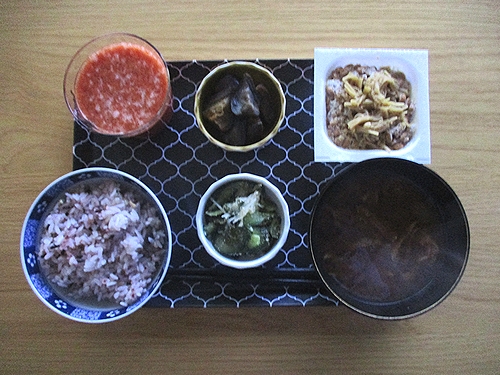 なす南蛮、チンゲンサイと人参の和え物、なめ茸入り納豆、玉ねぎとしめじと油揚げの味噌汁、トマトジュース。