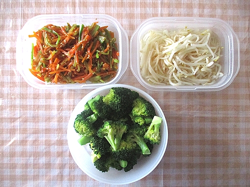 ブロッコリーの芯と人参のきんぴら、酢もやし、レンチンブロッコリー。