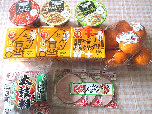 スープデリ3P、納豆3P、みかん、3食入り蕎麦、3連ロースハム、以上で税込み1611円なり~。