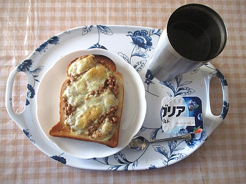 納豆チーズトースト、ヨーグルト、紅茶。