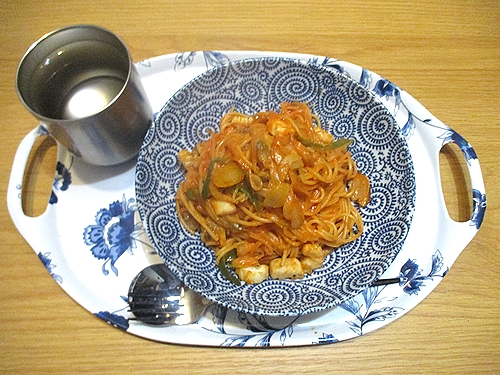 シーフードミックス、玉ねぎ、ピーマン、椎茸入りナポリタン。