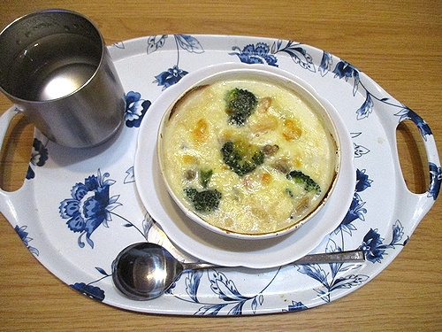 ブロッコリー、シーフードミックス(海老、イカ、アサリ)入りの豆腐グラタン、この後ヨーグルト。