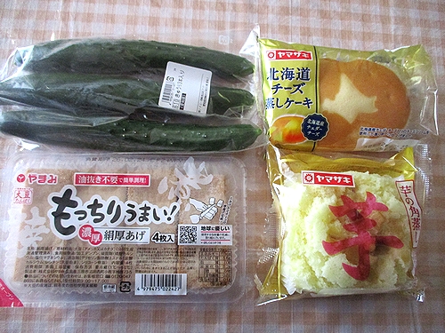きゅうり、厚揚げ、菓子パン2個、以上で税込み531円でした。