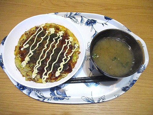 キャベツ、もやし、椎茸、ちくわ、あげ玉入りお好み焼き、しじみ汁、この後ヨーグルト。