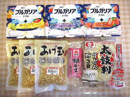 ヨーグルト3P、あげ玉3P、かまぼこ、3食入りうどん、以上で税込み982円でした。