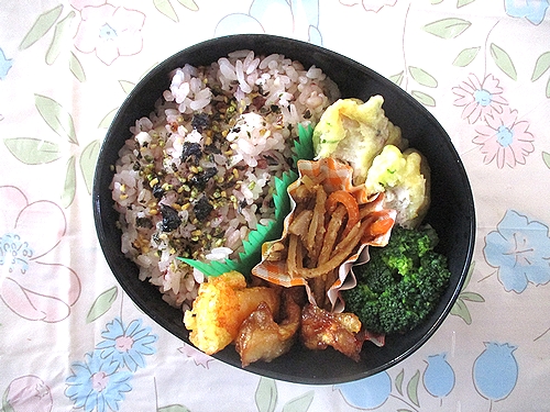 マグロの天ぷら、イカ天、エリンギの唐揚げ、きんぴらごぼう、ブロッコリー。