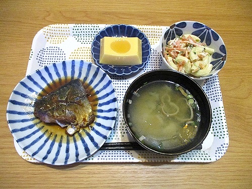 サバの味噌煮、マカロニサラダ、玉子豆腐、即席味噌汁、この後ヨーグルト。