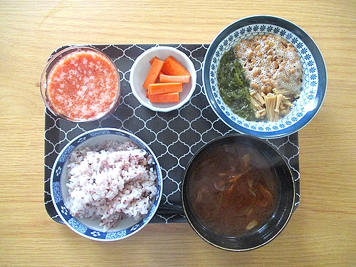 めかぶ&なめ茸&納豆、人参のぬか漬け、玉ねぎとしめじと油揚げの味噌汁、トマトジュース。
