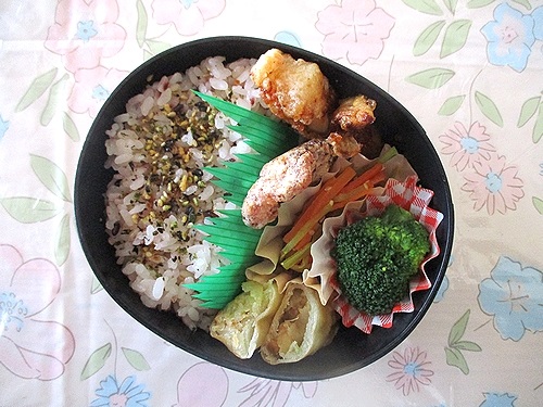 鶏むね肉の唐揚げ、エリンギの唐揚げ、五目春巻、ブロッコリーの芯と人参のきんぴら、ブロッコリー。