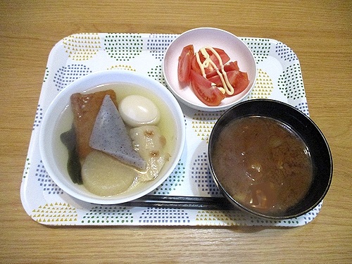 おでん、トマト、味噌汁、この後ヨーグルト。