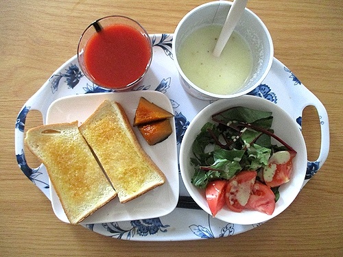 トースト、スープデリ、かぼちゃの煮物、ベビーリーフ&トマト、トマトジュース。
