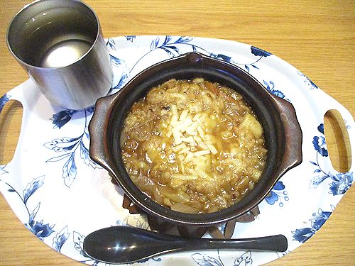 玉ねぎ、しめじ、ネギ、ちくわ、揚げ玉、チーズ入り雑炊、この後ヨーグルト。