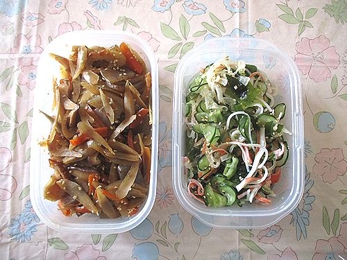 ごぼうとちくわの甘辛炒め、きゅうりとカニカマの酢の物。