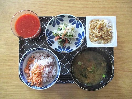 きゅうりとカニカマの酢の物、なめ茸入り納豆、鮭フレーク、即席みそ汁、トマトジュース。