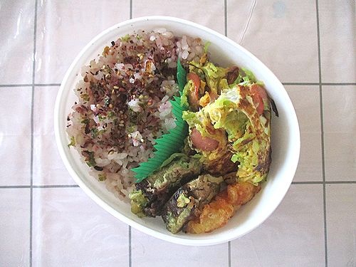 キャベツとウインナー入り玉子焼き、マグロのたたきの天ぷら、イカ天。
