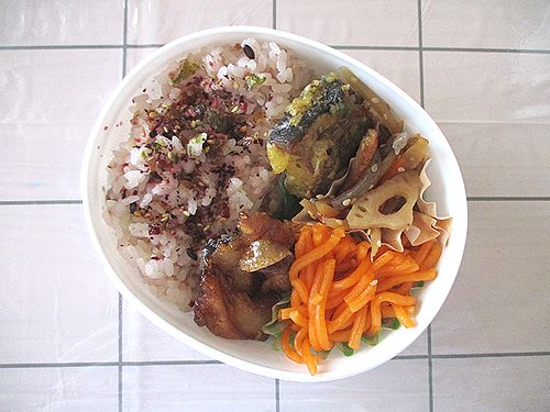 マグロのたたきの天ぷら、エリンギの唐揚げ、味付けスパゲティ、きんぴらごぼう。