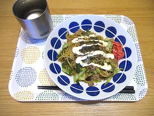 キャベツ、ピーマン、椎茸、豚肉入り焼きそば、この後ヨーグルト。