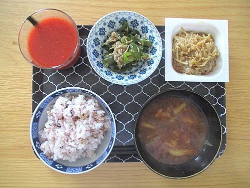 ピーマンとしらすのおかか炒め、なめ茸入り納豆、キャベツとしめじと油揚げの味噌汁、トマトジュース。